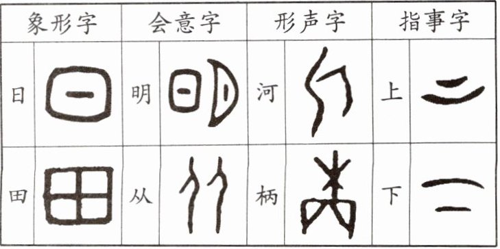 | 象形字 | 会意字 | 形声字 | 指事字 |