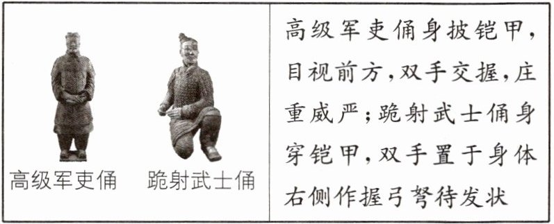 高级军吏俑身披铠甲,目视前方,双手交握,庄重威严;跪射武士俑身穿铠甲,双手置于身体右侧作握弓弩待发状