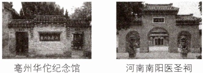 (2)[示例一]亳州华佗纪念馆:亳州华佗纪念馆是为纪念华佗而建。华佗是东汉末年的名医,擅长用针灸、汤药为人治病,能实施外科手术。他发明了“麻沸散”,让病人将其和酒一起服下,失去知觉,然后进行手术。他还创编出了“五禽戏”,帮助人们强身健体。[示例二]河南南阳医圣祠:河南南阳医圣祠是为纪念张仲景而建。张仲景是东汉末年的名医,写成《伤寒杂病论》一书。他发展了“治未病”的思想,提倡预防疾病。张仲景是中医临床理论体系的开创者,为中医药学的发展作出巨大贡献。他医术精湛,医德高尚,被后世称为“医圣”。(任选一处回答即可)
