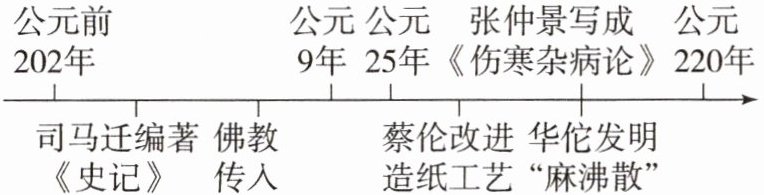 C [解析]根据时间轴上的信息“公元前202-公元220年”“司马迁编著《史记》”“佛教传入”“蔡伦改进造纸工艺”“张仲景写成《伤寒杂病论》”“华佗发明‘麻沸散’”可知,该时间轴反映的是两汉时期的科技与文化。故选C项。