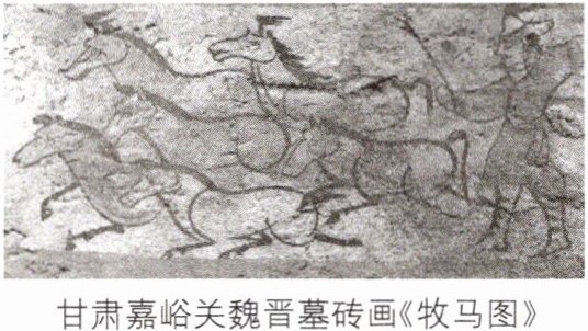 B [解析]结合所学知识可知,甘肃嘉峪关魏晋墓砖画《牧马图》描绘了北方民族的游牧生活。故选 B 项。