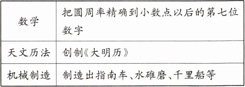 4 教材正文改编 下表是某同学整理的有关祖冲之的资料。据此可知,他( )