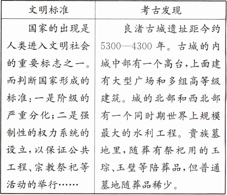|国家的出现是人类进入文明社会的重要标志之一。而判断国家形成的标准:一是阶级的严重分化;二是强制性的权力系统的设立,以保证公共工程、宗教祭祀等活动的举行……|良渚古城遗址距今约5300—4300年。古城的内城中部有一个高台,上面建有大型广场和多组高等级建筑。城的北部和西北部有一个同时期世界上规模最大的水利工程。贵族墓地里,随葬有祭祀用的玉琮、玉璧等陪葬品,但普通墓地随葬品稀少。|