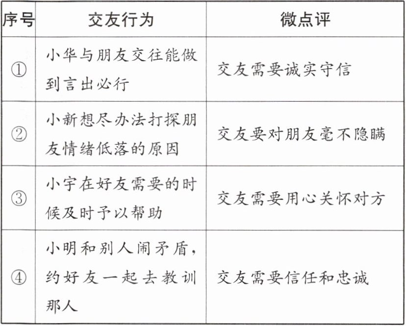 6 (2025·山东青岛期中)下表中对交友行为的"微点评",正确的有( )
