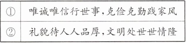(3)①春联“唯诚唯信行世事,克俭克勤践家风”承载了诚实守信、勤俭节约的中华传统家风。②春联“礼貌待人人品厚,文明处世世情隆”承载了文明礼貌的中华传统家风。
