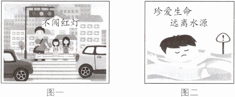 (1)①图一:交通安全。图二:防溺水安全。②树立安全意识与规则意识,增强风险意识,提高防护能力。