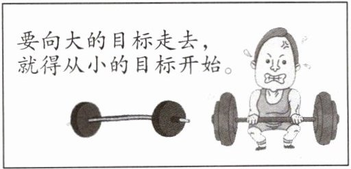 D [解析]本题考查实现规划的方法。依据教材知识,分析漫画,"要向大的目标走去,就得从小的目标开始"启示我们千里之行,始于足下,D符合题意;"尺有所短,寸有所长"强调人各有长处,也各有短处,彼此都有可取之处,与题干无关,A不符合题意;"没有规矩,不成方圆"强调规则的重要性,与题干无关,B不符合题意;"知人者智,自知者明"强调我们要正确认识自己,与题干无关,C不符合题意。