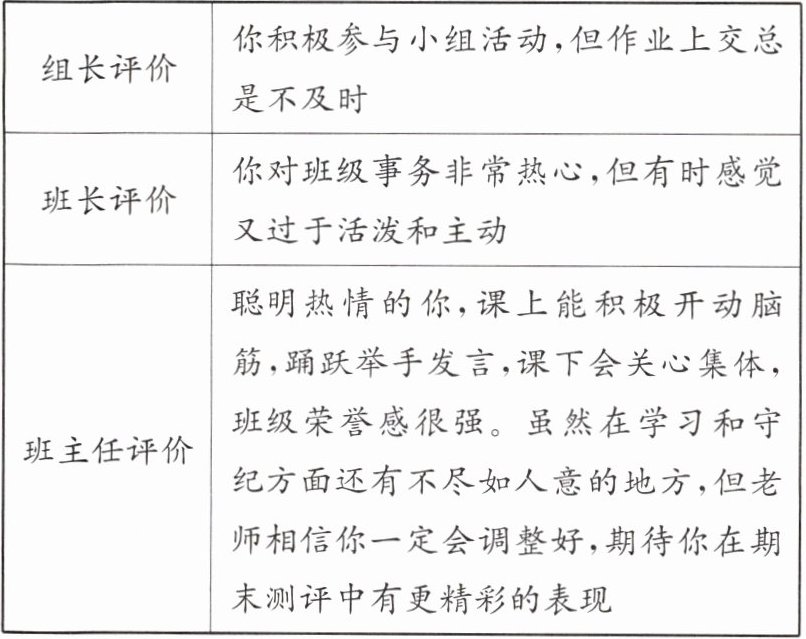 材料二 开学一个多月后,班主任组织同学们进行综合素质测评。下面是小福同学评价手册中的部分内容: