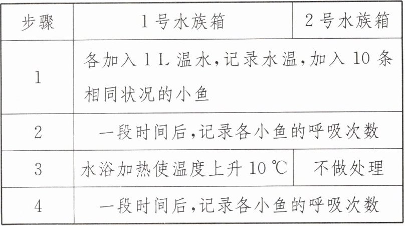 |1|各加入1L温水,记录水温,加入10条相同状况的小鱼|