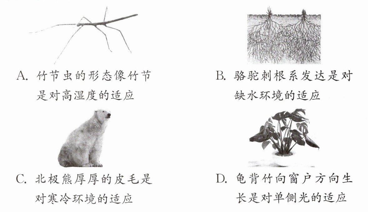 A [解析]竹节虫酷似竹节,目的是与环境一致,避免被敌害发现,是生物适应环境的表现,与高湿度无关,A错误;沙漠地区干旱少雨,骆驼刺根系发达是对缺水环境的适应,B正确;北极熊厚厚的脂肪层和皮毛可以保温,是北极熊对北极寒冷环境的适应,C正确;植物感受刺激并作出反应的特性称为植物的感应性,龟背竹向窗户方向生长是对单侧光的适应,D正确。