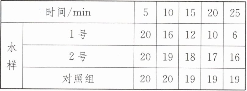 |时间/min|5|10|15|20|25|水样|1号|20|16|12|10|6|水样|2号|20|19|18|17|16|水样|对照组|20|20|19|19|19|