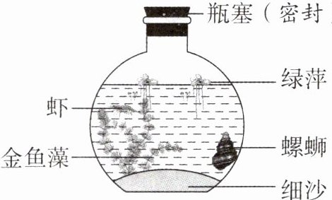 2 下图是一个密闭的生态瓶,里面的虾、金鱼藻、螺蛳、绿萍等生物能够存活很长时间。下列关于该生态瓶的说法,正确的是(