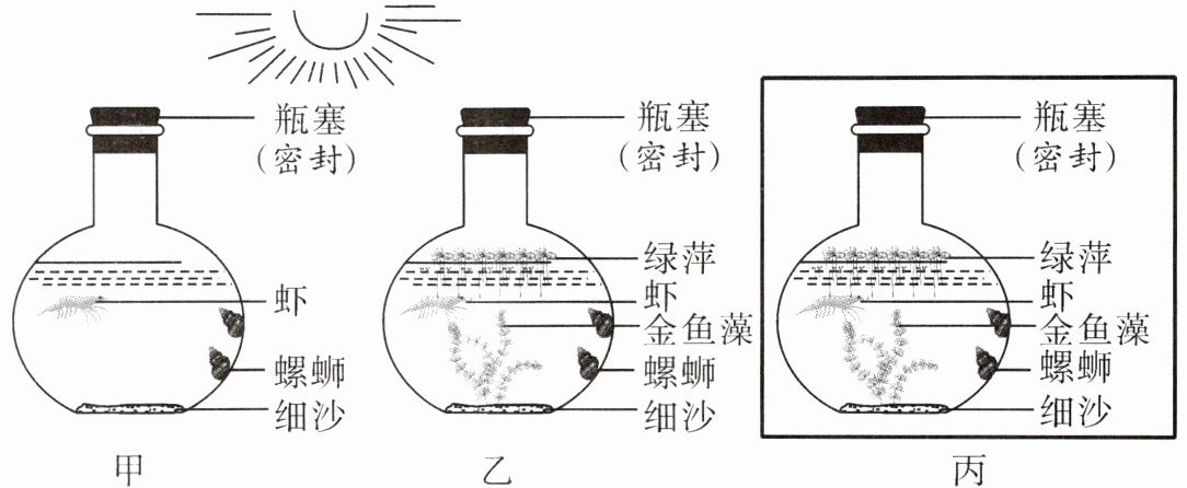 4 (2024·宿迁中考)某生物兴趣小组通过制作生态瓶来探究生态系统的组成及其稳定性。实验装置如图所示(甲、乙瓶置于有光的条件下,丙瓶用不透光的盒子罩住)。下列说法正确的是(