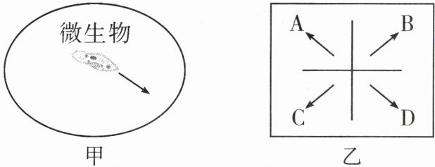 4 某同学用显微镜观察水中微生物,下图甲表示显微镜视野中微生物游走方向,为了不使该微生物从视野中消失,则载玻片移动的方向是图乙中的(