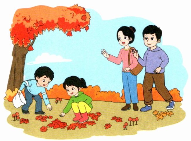 qiū tiān dào le, bà ba□□hé mā ma□□dài wǒ men qù jiāo wài jiǎn hóng yè, cǎi mó gu。
