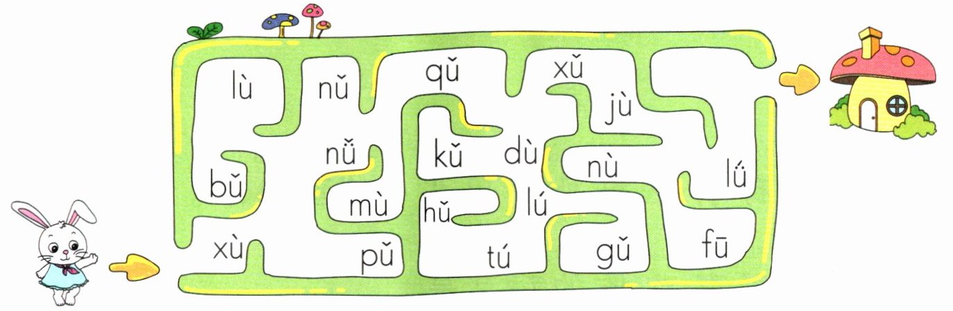 4. 用“○”圈出韵母是“ü”的音节,帮小兔回家。