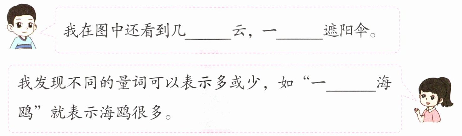 3. 情境题 欣赏小全的画作,把合适的量词填入括号里,并完成练习。
