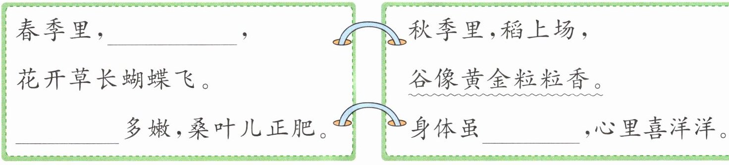 春季里,□□,花开草长蝴蝶飞。□□多嫩,桑叶儿正肥。