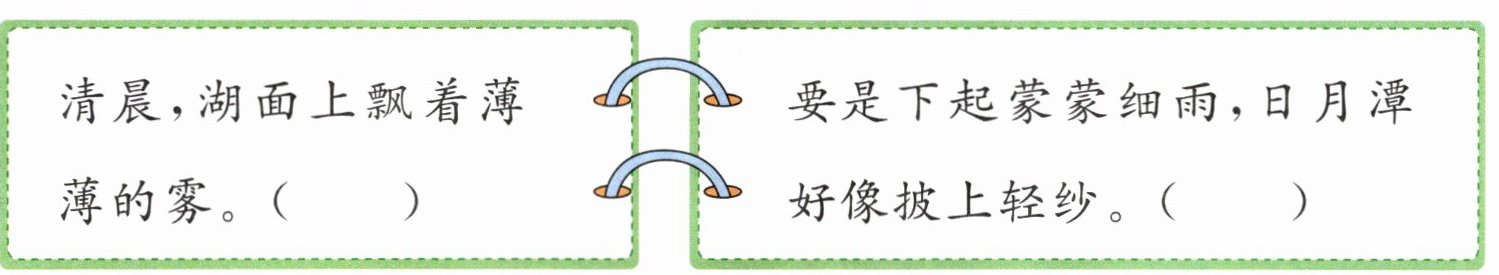 清晨,湖面上飘着薄薄的雾。( ) 要是下起蒙蒙细雨,日月潭好像披上轻纱。( )