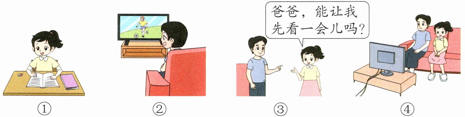 "爸爸,我喜欢的节目就要开始了,能让我先看一会儿吗?"梅梅说。