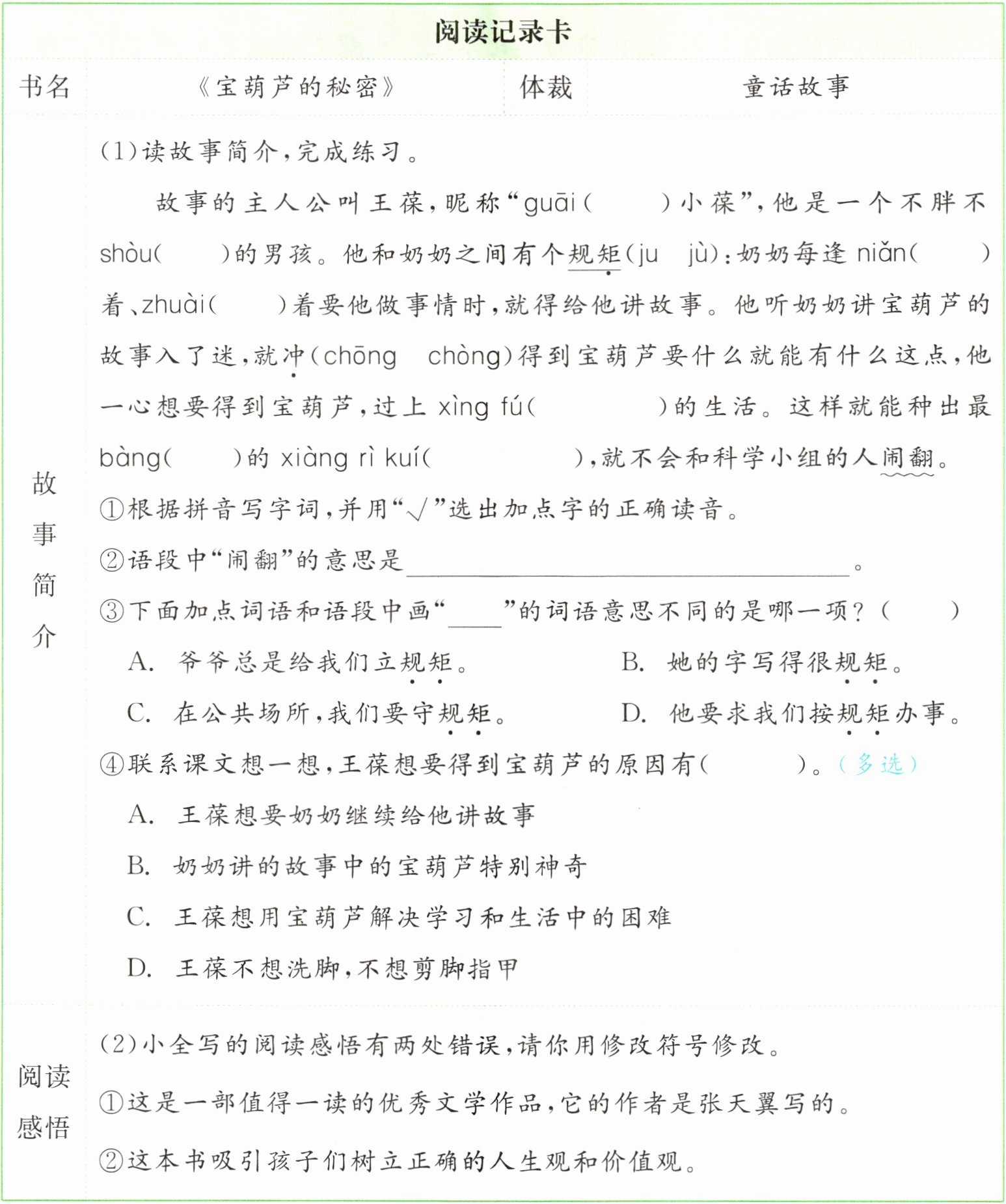 1. 小全读完故事后做了记录卡,读一读,完成练习。