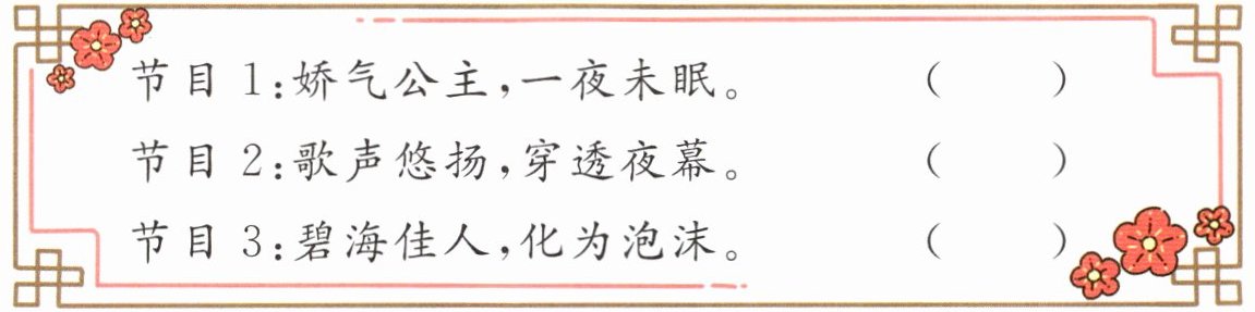 (1)看节目单,猜猜演的是《安徒生童话》中的哪些故事,选一选。