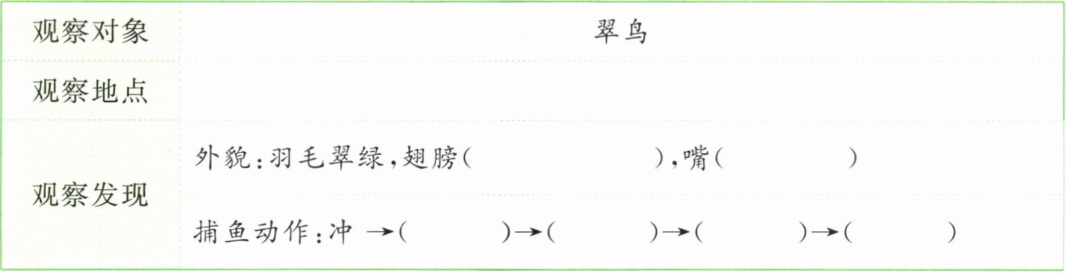 3. 做观察记录 读完课文,同学们做了观察记录单,请你协助他们完成记录。