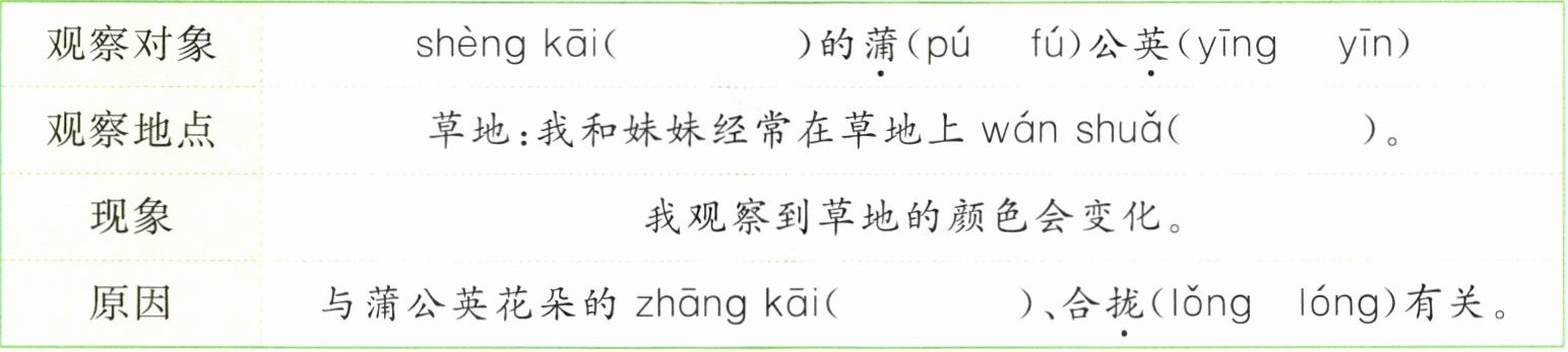 1. 小全记录了草地颜色的变化过程,并制作了记录单,请你完成练习。