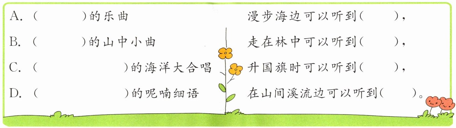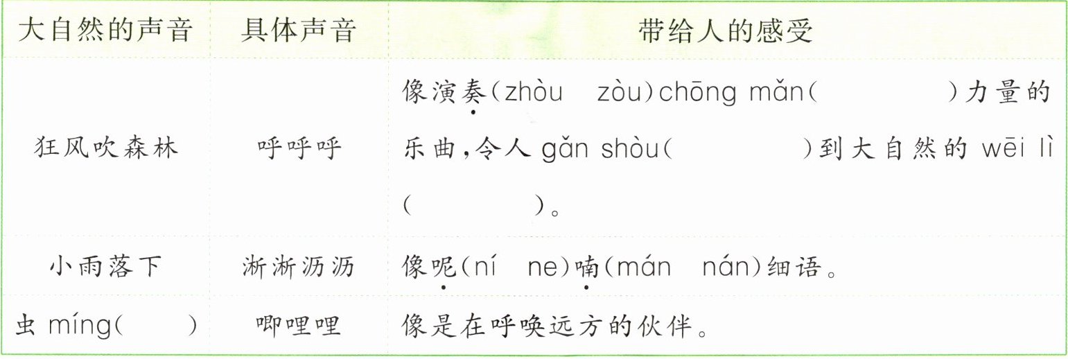1. 小艺在笔记里记录了大自然的声音,请你帮她完善表中的内容。