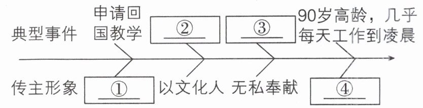 【解析】本题考查梳理文章内容的能力。第①空,由第①~④段内容可知,虽然叶嘉莹历经诸多困苦后在国外生活安稳,但她仍心系祖国的古典文化,毅然决然选择回国,凸显出她对祖国深厚的热爱之情,她想要为祖国的文化传承贡献力量,这种热爱驱使她回国开启文化传承之路。据此可概括为:热爱祖国。第②空,第⑨段中,叶嘉莹刚回国就在南开大学授课,而且课程很受学生欢迎。第⑩段中,叶嘉莹不仅在多所高校讲学,还应邀面向社会各界开展古典诗词系列专题讲演,影响力极大,将古典诗词文化传播到更多地方,让不同年龄段、不同身份的人都能领略到古典诗词的魅力,切实地在多地进行文化传播工作。据此可概括为:多处讲学,传播文化。第③空,结合思维导图中的“无私奉献”和第⑫段“她还捐献出自己退休金的一半(10万美元)建立了‘驼庵奖学金’和‘永言学术基金’,用以吸引和培养国内优秀人才从事中国古典文学方面的普及和研究工作”可知,此处可概括为:捐献退休金的一半建立“驼庵奖学金”和“永言学术基金”。第④空,结合思维导图中的“90岁高龄,几乎每天工作到凌晨”可定位到第⑬段,通读第⑬段内容可概括出:勤勉敬业。