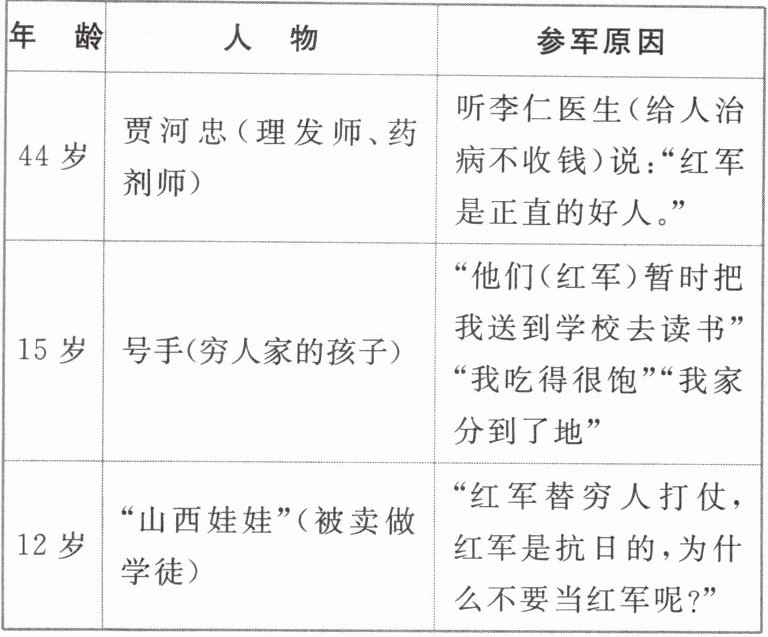 从年龄角度看,不同年龄层人物展示了红军影响力广泛。从人物身份角度看,不同身份者参军表明红军吸引力强。从参军原因角度看,体现红军为人民利益而战,让人全面理解其性质和影响力。(每个角度1分,共3分)