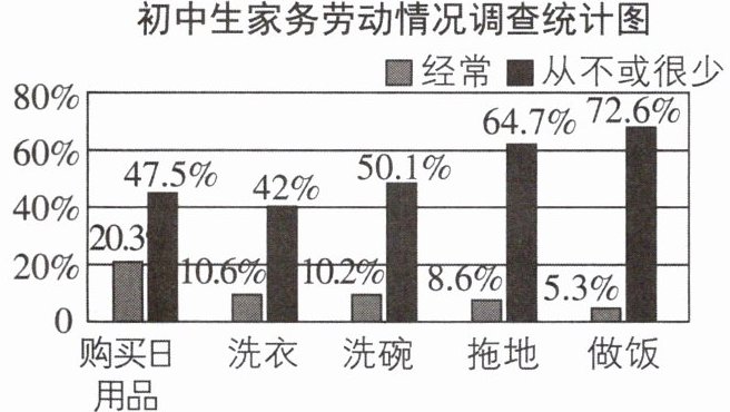 (1)【示例一】该校初中生进行的家务劳动中购买日用品的比例最高,做饭的比例最低。【示例二】该校大部分初中生从不或很少做家务劳动(或:该校初中生经常做家务劳动的比例很低)。