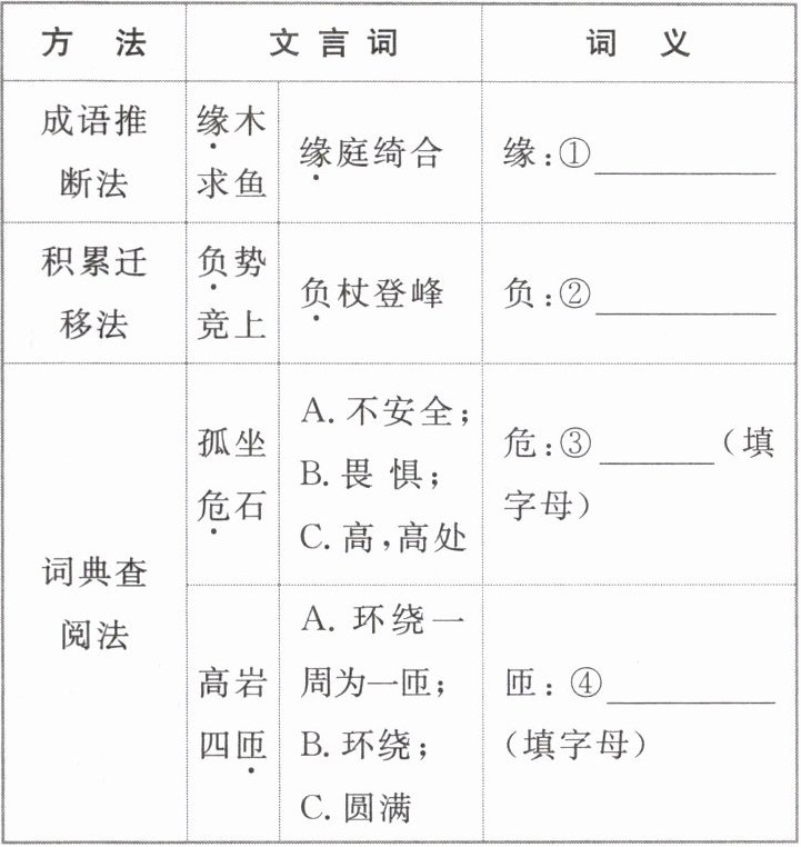 杖登峰 负:②____||词典查阅法|孤坐危石|A.不安全; B.畏惧; C.高,高处 危:③____(填字母)|