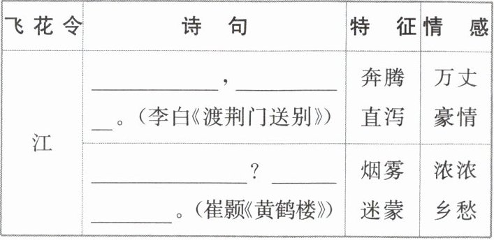 (2)[2024 四川遂宁中考改编]为丰富研学活动形式,校团委设计了有关“江”的飞花令,开启研学之旅。下列是同学们整理的诗句,请你根据提示补充完整。