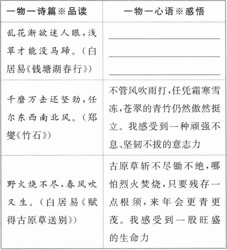 14 新考法 漫步古诗苑,你们小组准备编纂一本《人间草木》集,请按提示完成下面表格。