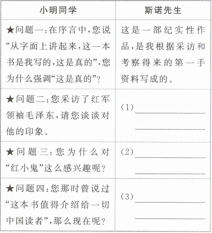 13 新考向 整本书阅读 跨越时空,与斯诺相遇。小明同学读完《红星照耀中国》后,有一些问题想向斯诺先生请教。请你依据这本书的内容,推测斯诺先生会怎样回答。(6分)