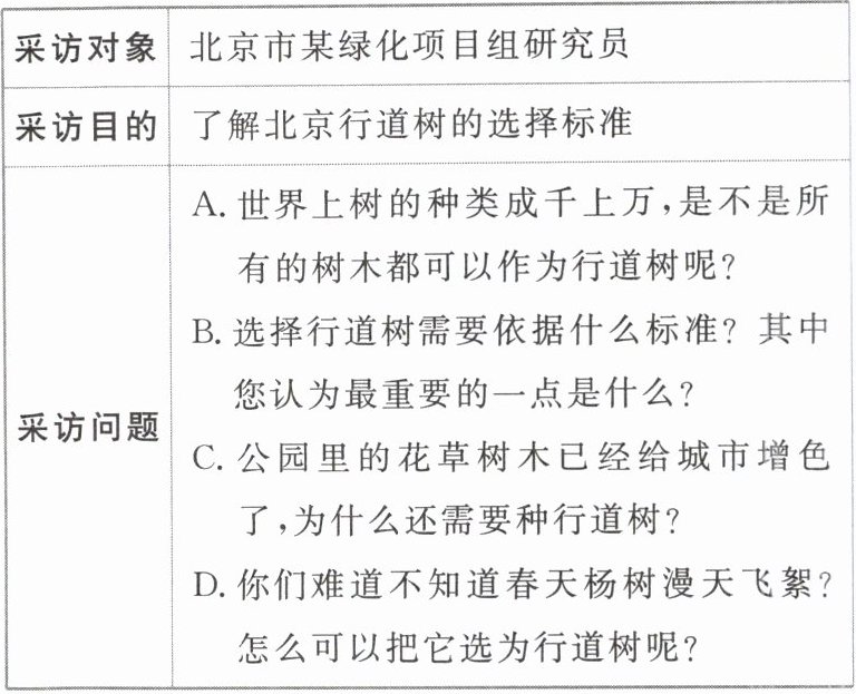 3 如何才能成为行道树?同学们就这个问题对园林专家进行了采访。下面是同学们的采访提纲,请你帮助选出采访问题中语言不得体的一项,并进行修改。