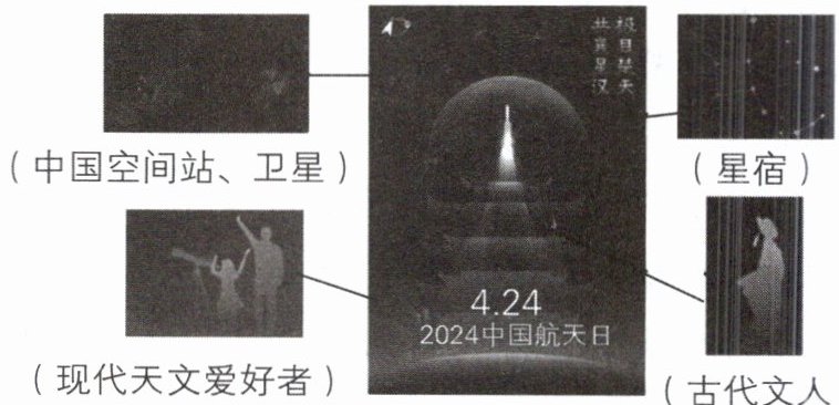 11 核心素养 审美创造 [2025陕西汉中调研]2024年4月24日是第九个“中国航天日”。学校“问天”天文社团开展“极目楚天,共襄星汉”主题活动。下面是本次活动中评选出的优秀宣传海报作品,请你结合下图中海报局部放大的画面,解读海报中隐含的文化内涵和象征意义。(4分)