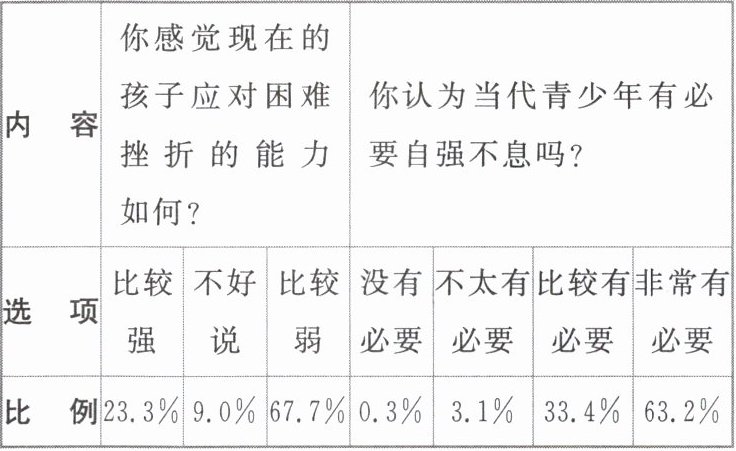 |内容|你感觉现在的孩子应对困难挫折的能力如何?|你认为当代青少年有必要自强不息吗?|