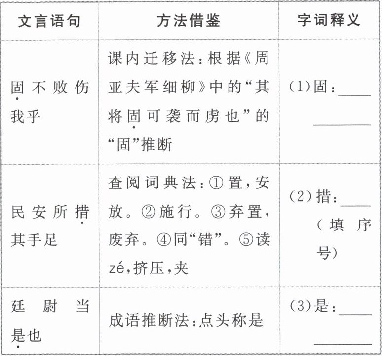 可袭而虏也”的“固”推断|(1)固:____||民安所措其手足|查阅词典法:①置,安放。②施行。③弃置,废弃。④同“错”。⑤读zé,挤压,夹|(2)措:____(填序号)|