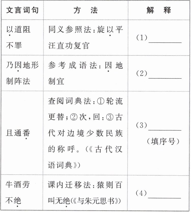 |查阅词典法:①轮流更替;②次,回:③古代对边境少数民族的称呼。(《古代汉语词典》)|(3)____(填序号)||牛酒劳不绝|课内迁移法:猿则百叫无