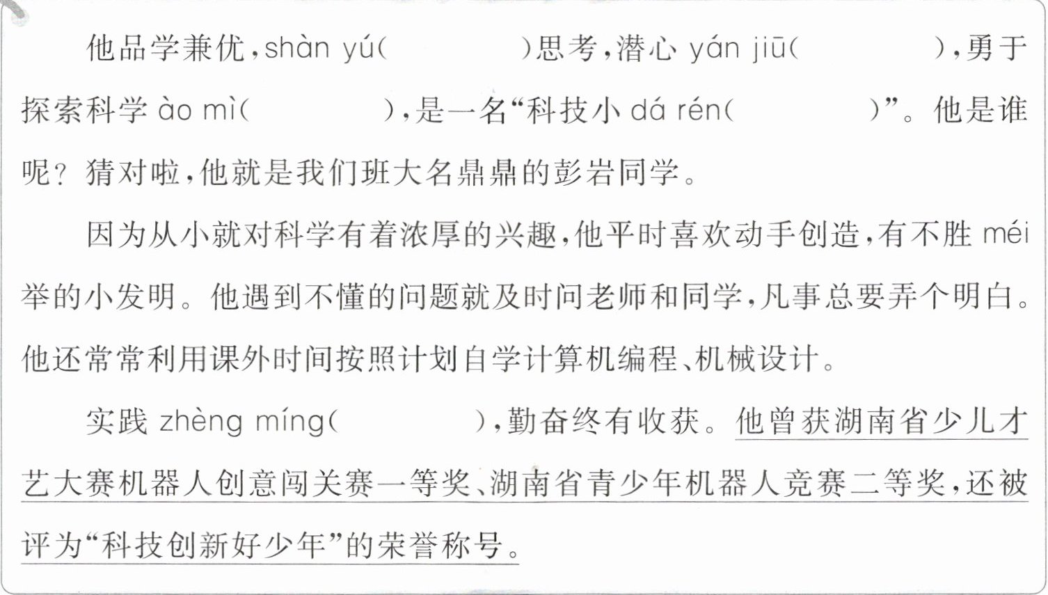 )”。他是谁呢?猜对啦,他就是我们班大名鼎鼎的彭岩同学。因为从小就对科学有着浓厚的兴趣,他平时喜欢动手创造,有不胜 méi 举的小发明。他遇到不懂的问题就及时问老师和同学,凡事总要弄个明白。他还常常利用课外时间按照计划自学计算机编程、机械设计。
