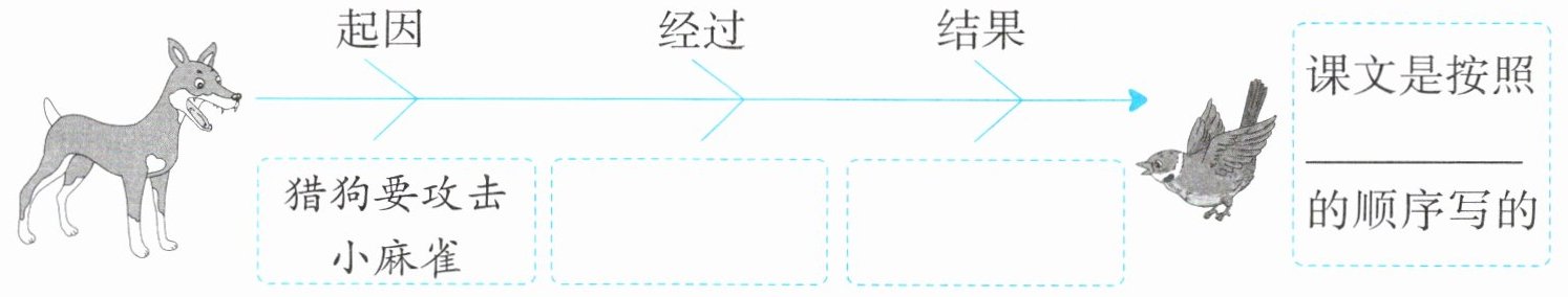 3 经过:老麻雀拯救幼儿 结果:猎狗退缩 课文是按照事情发展的顺序写的起因 经过 结果