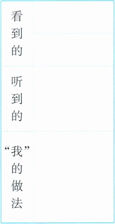 2. 将自己看到的、听到的写清楚。读例文,填表格。