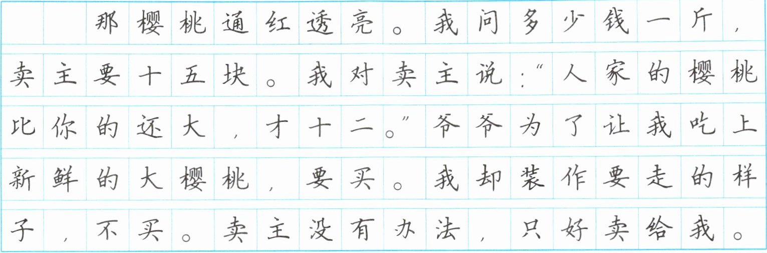②运用动作、神态、心理等描写方法,将“我”和爷爷买樱桃的过程写具体。