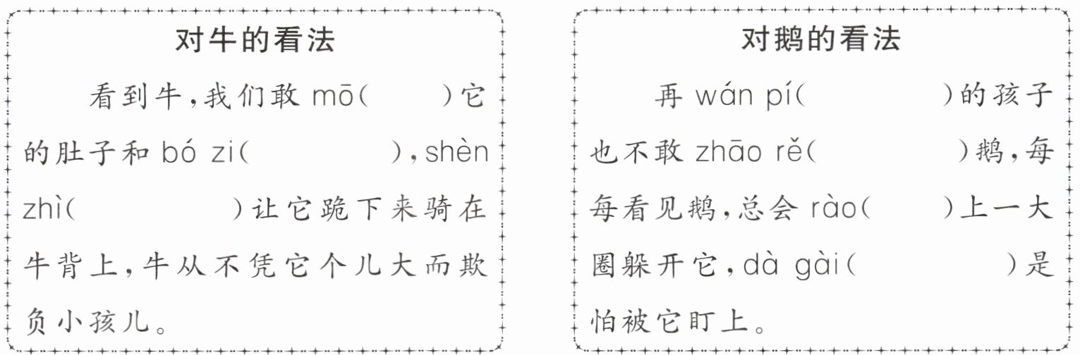 1. 下面是小全口述的对牛和鹅的看法,帮小全补充完整。
