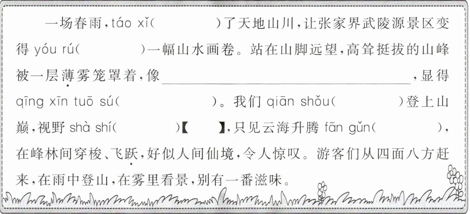一场春雨,táo xǐ( )了天地山川,让张家界武陵源景区变得 yóu rú( )一幅山水画卷。站在山脚远望,高耸挺拔的山峰被一层
