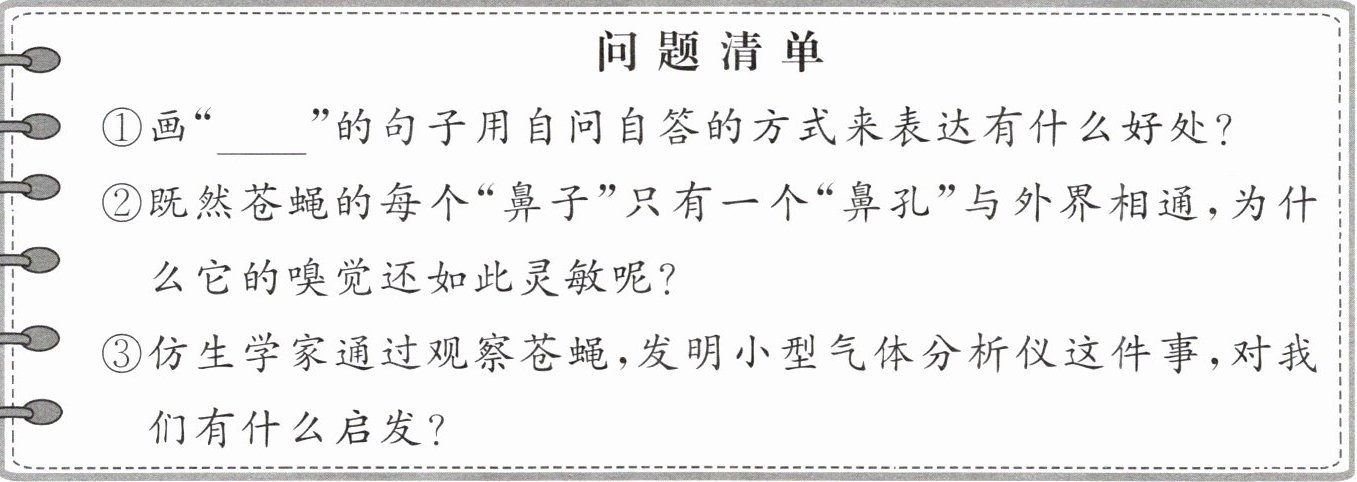 ,但仿生学却把它们紧密地联系起来了。②苍蝇是声名狼藉的“逐臭之夫”,凡是腥臭污秽的地方,都有它们的踪迹。苍蝇的嗅觉特别灵敏,远在几千米外的气味也能嗅到。但是苍蝇并没有“鼻子”,它靠什么来充当嗅觉器官呢?原来,苍蝇的“鼻子”——嗅觉感受器分布在头部的一对触角上。