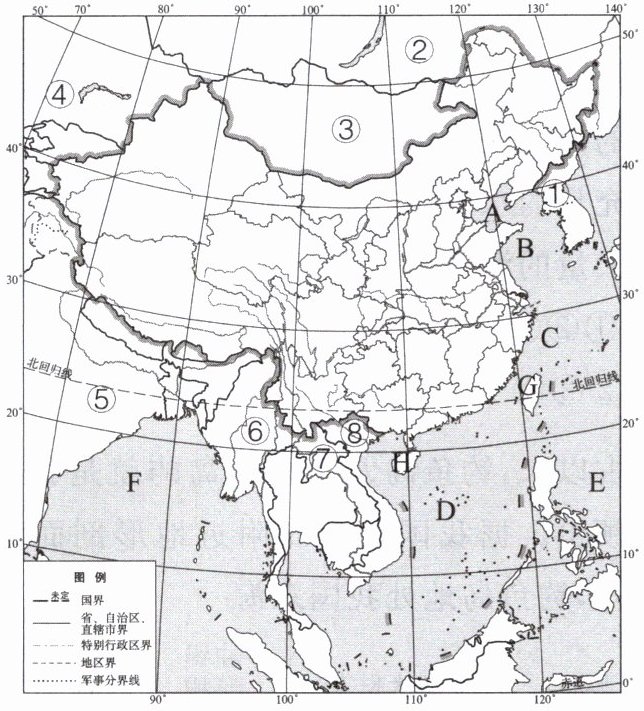 (1)朝鲜 俄罗斯 蒙古 哈萨克斯坦 印度 渤海 黄海 东海 南海 太平洋 印度洋 台湾岛 海南岛