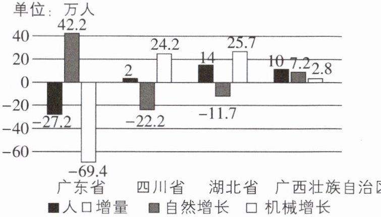 1.A 【解析】由图可知,受人口回流现象影响最显著的是广东省,人口机械增长为-69.4 万人,A正确。故选 A。